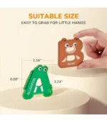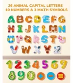 - Diseño único: cada pieza cuenta con una ilustración vívida de animal correspondiente a la letra, como un cocodrilo para «A». El conjunto también incluye los números del 0 al 9 y tres símbolos matemáticos básicos (más, menos, igual), lo que lo hace ideal para introducir a los niños a operaciones matemáticas simples. Una colección encantadora y educativa de juguetes de aprendizaje