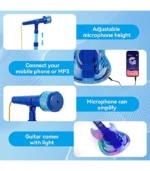 Juego de guitarra y micrófono para niños, máquina de karaoke con música y luz, juguetes de micrófono con soporte, juguetes de guitarra de altura ajustable para niños, niños pequeños (azul)