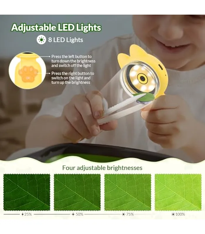 - 8 luces LED y batería de 650 mAh: este mini microscopio para niños está equipado con 8 luces LED con 4 niveles de brillo ajustables para una observación clara de objetos en diferentes entornos. Batería de iones de litio incorporada de 650 mAh, 1,5 horas de carga completa = 2,5 horas de uso continuo.