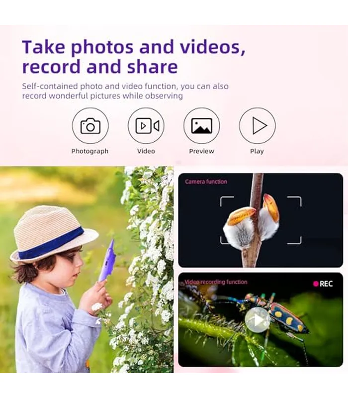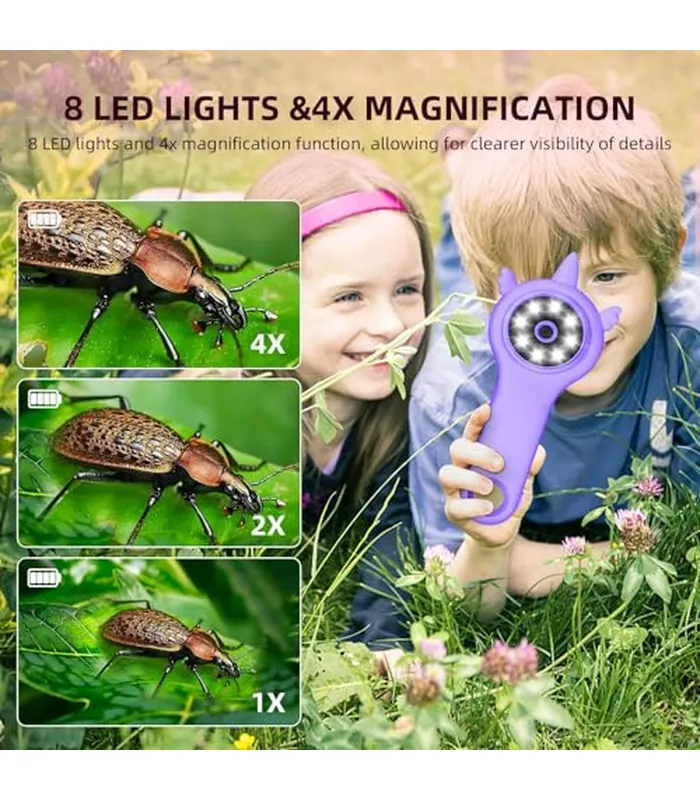 - Microscopio digital 4X y lupa 500X: a diferencia de otros microscopios para niños, esta equipada con lupa 500X y un botón de ajuste de zoom 4x, lo que permite a los niños examinar de cerca los puntos en las mariquitas, las alas de las abejas, las venas de las plantas, los intrincados diseños en monedas y las fibras en las telas, embarcándose en un emocionante viaje de exploración microscópica