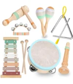 - Juego de instrumentos musicales: este vibrante juego consta de una variedad de instrumentos musicales perfectos para niños. Este juego incluye 1 xilófono, 2 palos de madera, 1 pandereta, 1 clarinete, 1 campana de mano, 1 triángulo, 1 sonda de madera y 2 maracas. Todo convenientemente almacenado en una bolsa de transporte duradera, por lo que es fácil para los niños llevar sus aventuras musicales sobre la marcha. Con este conjunto, tus pequeños tienen todo lo que necesitan para crear melodías encantadoras y explorar el mundo de la música con alegría y emoción.